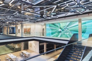 Moderne Büro-Kantine mit Mitarbeitern und Treppe, gute Beleuchtung