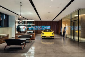 Modernes beleuchtetes Bürogebäude bei Dämmerung.